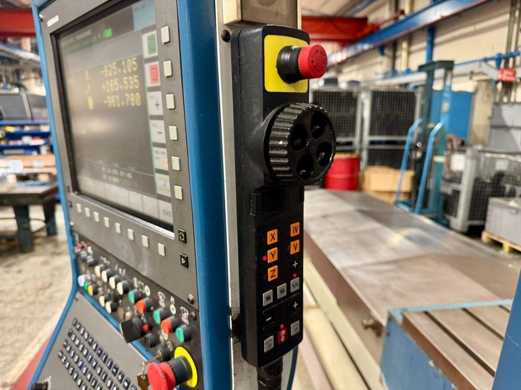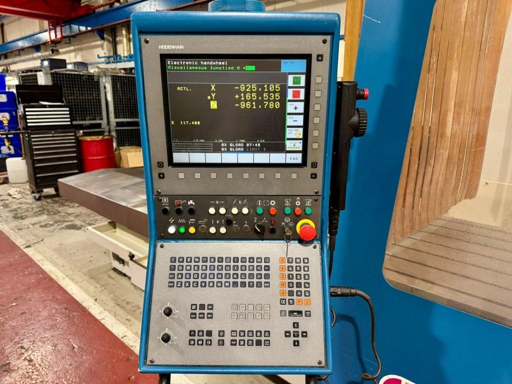 Table size 4200mm x 1000mm. Longitudinal travel 4000mm. Cross traverse 1200mm. Vertical traverse 1500mm. Maximum weight on table 10000 kg. Spindle taper 50 ISO. Maximum speed range 3000 rpm. Main motor power 28 kW. Rapids 10m/min. Heidenhain TNC530 Control. Manual toolchange. Manual indexing head. Coolant. Overall dimensions L x W x H 9820mm x 6000mm x 3752mm. Approximate weight 21,600 kg