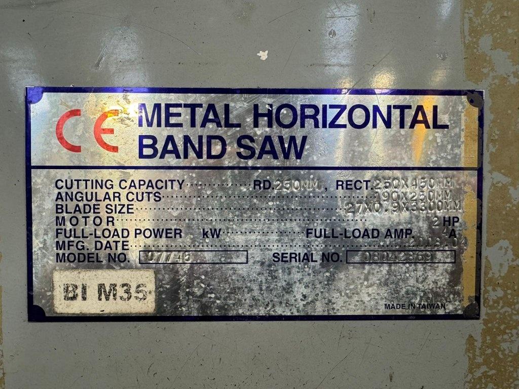Blade Size 27mm x 0.9mm x 3300mm. Cooloant. Round Bar Capacity 250mm. Rectangle 250mm x 450mm. Angular 190mm x 250mm. Blade Speeds 25-70M per minute. Dimensions L x W x H 1750mm x 650mm x 1100mm. Weight Approx. 350Kg