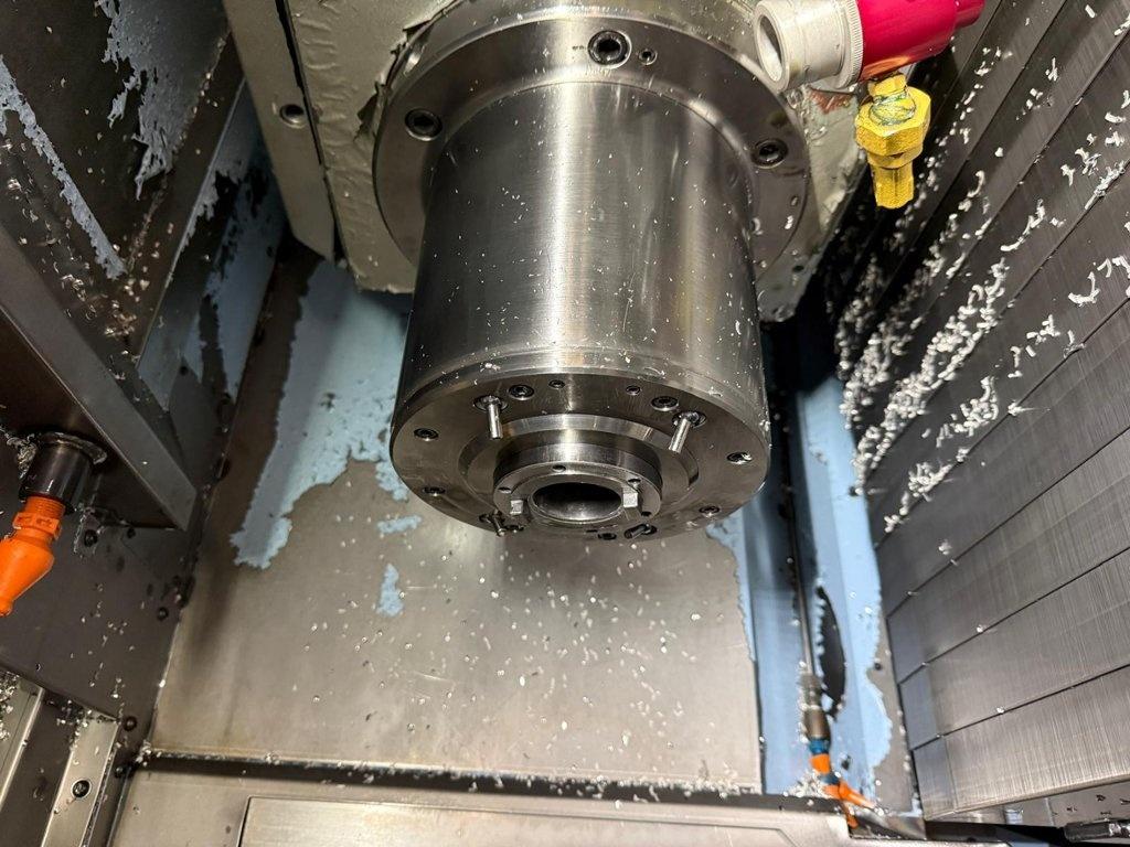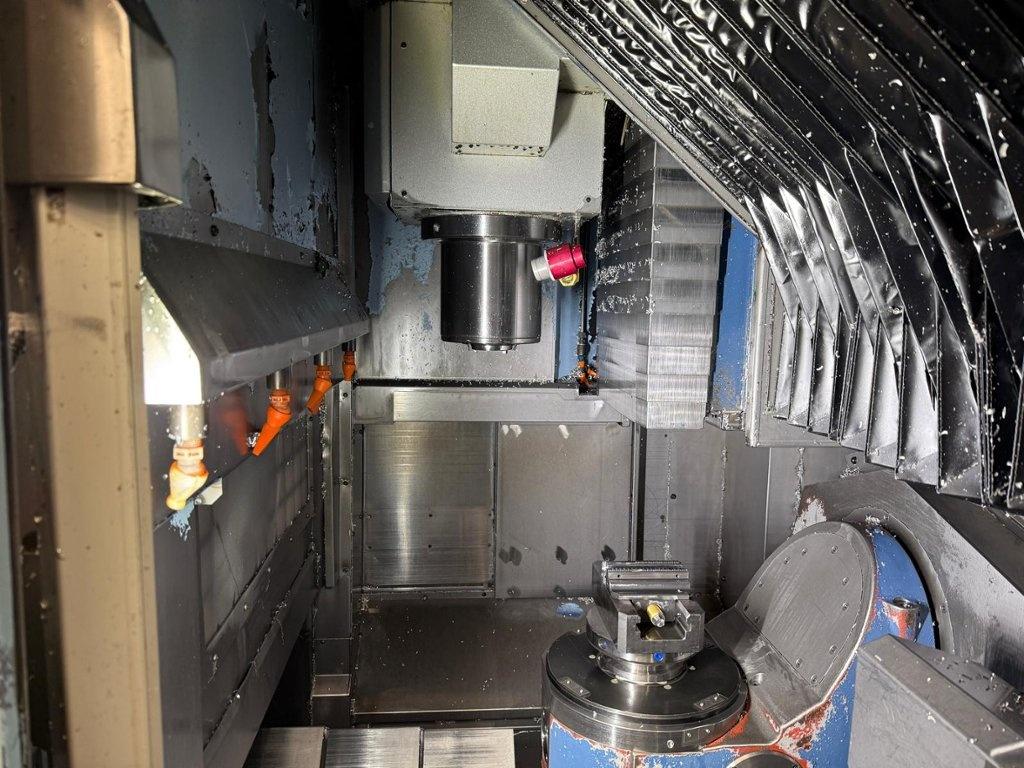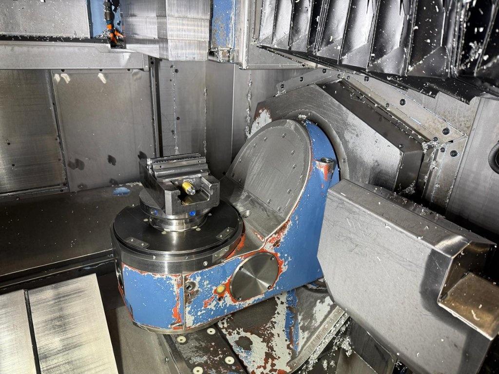 Twin pallet. Axis X 510 mm. Axis Y 410 mm. Axis Z 450 mm. B axis +/- 100 degrees. C axis 0.001 degrees 360 rotation. Max. part weight 40 kg. Maximum workpiece size 250mm x 250mm x 250mm. Number of tool pockets 30. Spindle taper BT 40. Max. spindle speed 15000 rpm. Spindle motor power 7.5 kW. FANUC G-Tech 30i. Year of manufacture 2004.