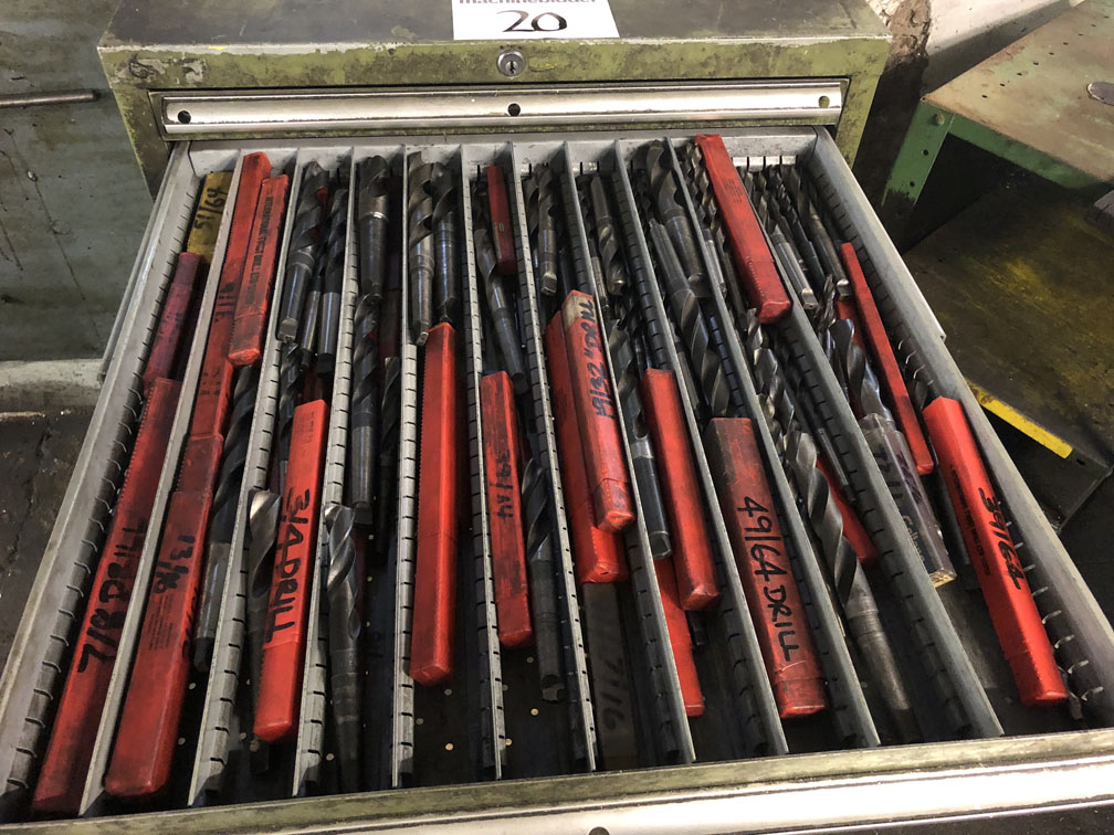 Lot 20: 11 drawer Cabinet of Twist Drills,End Mills, Slot Drills, Chucks etc