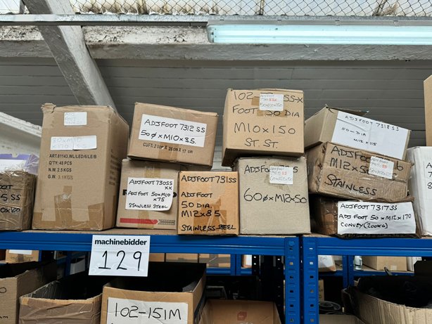 Lot 129: 4 x Bays of Shelving containing various end caps, knobs & adjustable feet