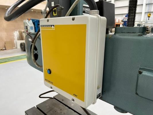 Min/Max distance spindle centre to column face 14 5/8″- 39 3/4″ Min/Max distance spindle nose to baseplate 202 – 46 1/4″. Quill Movement 7. 5/8″. No.4 Morse Taper. Spindle speeds 80 – 860 rpm. Feeds 0.004” – 0.016”/rev. Volt 415V. 0.65HP. Lo volt light. Box table. Serial No.169759