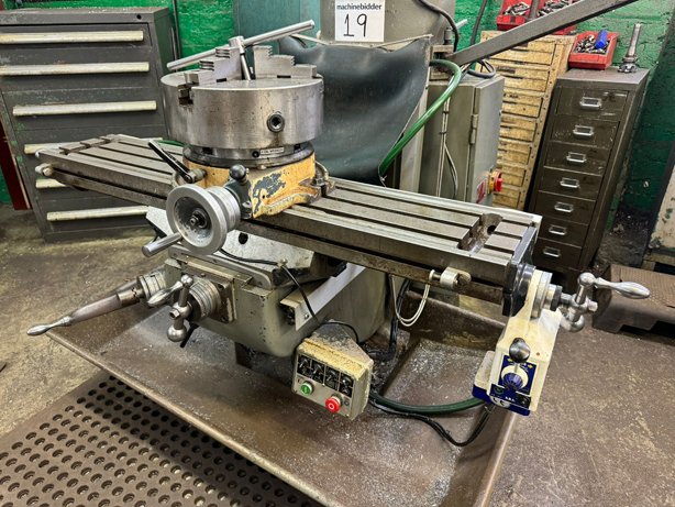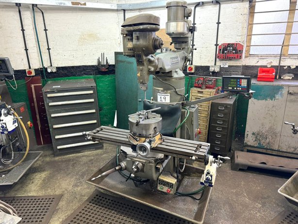 Table size 42'' x 9''. Spindle speeds 50-3750 rpm (inf.var).Spindle taper R8. Powered longitudinal feed. Coolant. Slotting Attachment. 13'' dia. Rotary Table/ 3 jaw chuck.Complete with accessories as lotted. Serial No. RM00980992. Year 1992.Overall dimensions 62'' x 62'' x 82''. Approx weight 1.25 tons