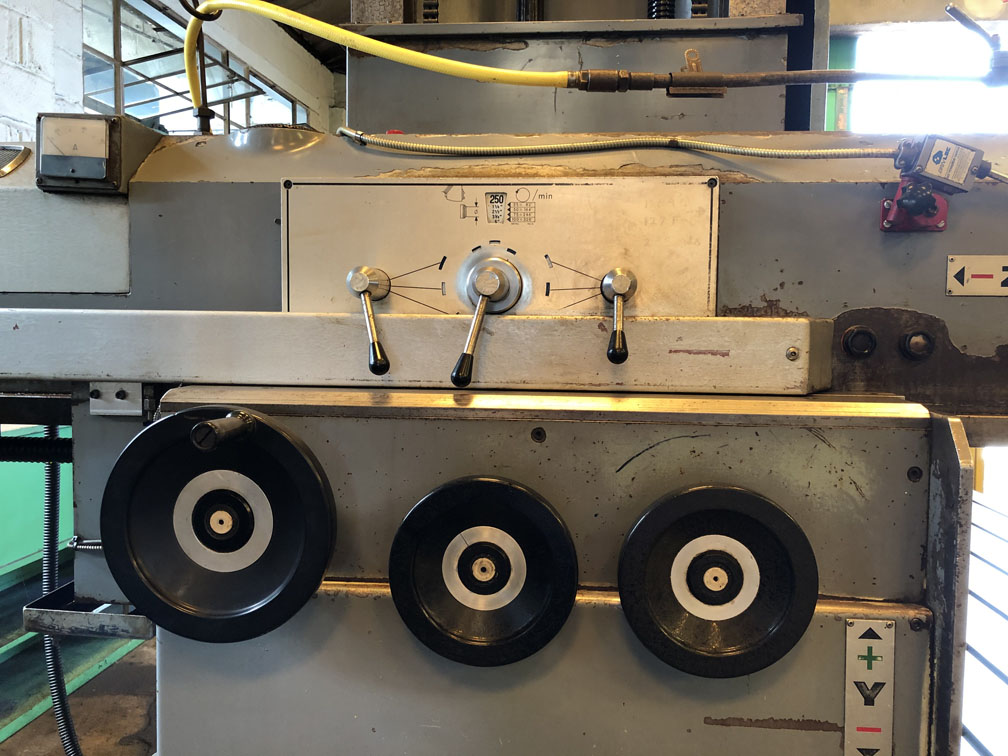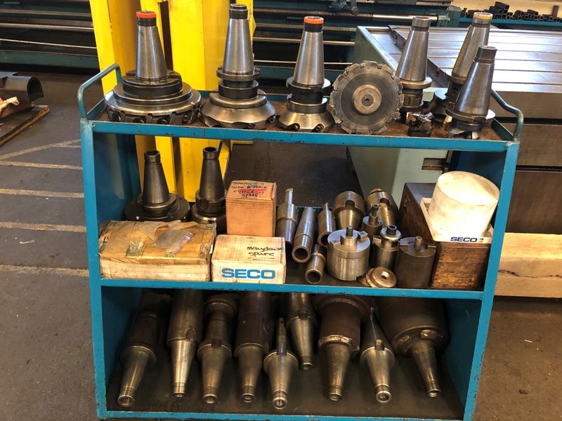 Bed size 12060mm x 1195mm x 790mm high. Overall size of bed 12400mm x 1195mm x 790mm high. Ram travel 980mm. Vertical travel 1675mm. Longitudinal travel 10300mm. Spindle speeds 30 - 2080 rpm. Spindle taper 50 ISO. Spindle motor 15 HP. Range of feeds per min 2 - 2000mm/min. Rapid traverse 2000mm/min. Newall DP1200 Digital readout. Drivloc DC Injection brake. 2 x Yellow concertina full length guards. Operators side guard. Newall DP7 Digital readout. Blue cabinet containing large quantity of Spindle tooling and tooling spares.