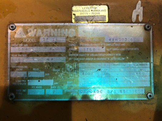 Model GP13. Serial Number 4AN10309. Year 1996. Rated Capacity 1750Kg.Complete with Forks