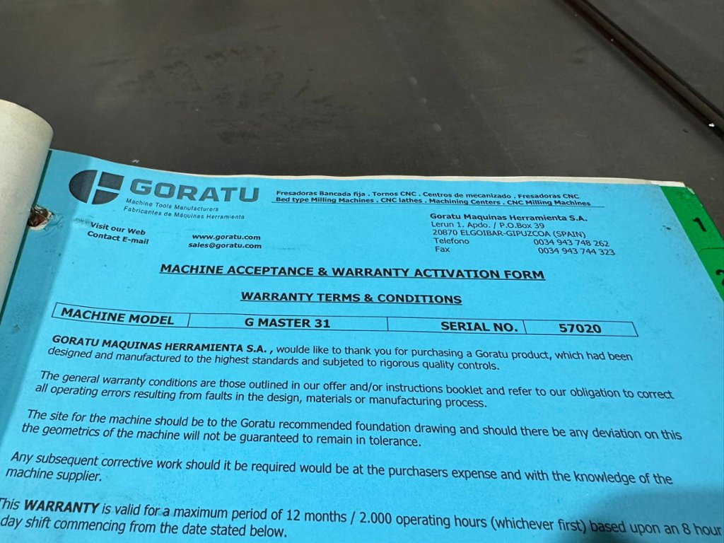 Table size 3100mm x 900mm. Longitudinal travel 3000mm. Cross traverse 1000mm. Vertical traverse 1500mm. Maximum weight on table 6000 kg. Spindle taper 50 ISO. Maximum speed range 3000 rpm. Main motor power 22 kW. Rapids 20m/min. Heidenhain TNC530 Control. Manual toolchange. Manual indexing head. Coolant. Overall dimensions L x W x H 8090mm x 4728mm x 3770mm. Approximate weight 17,000 kg