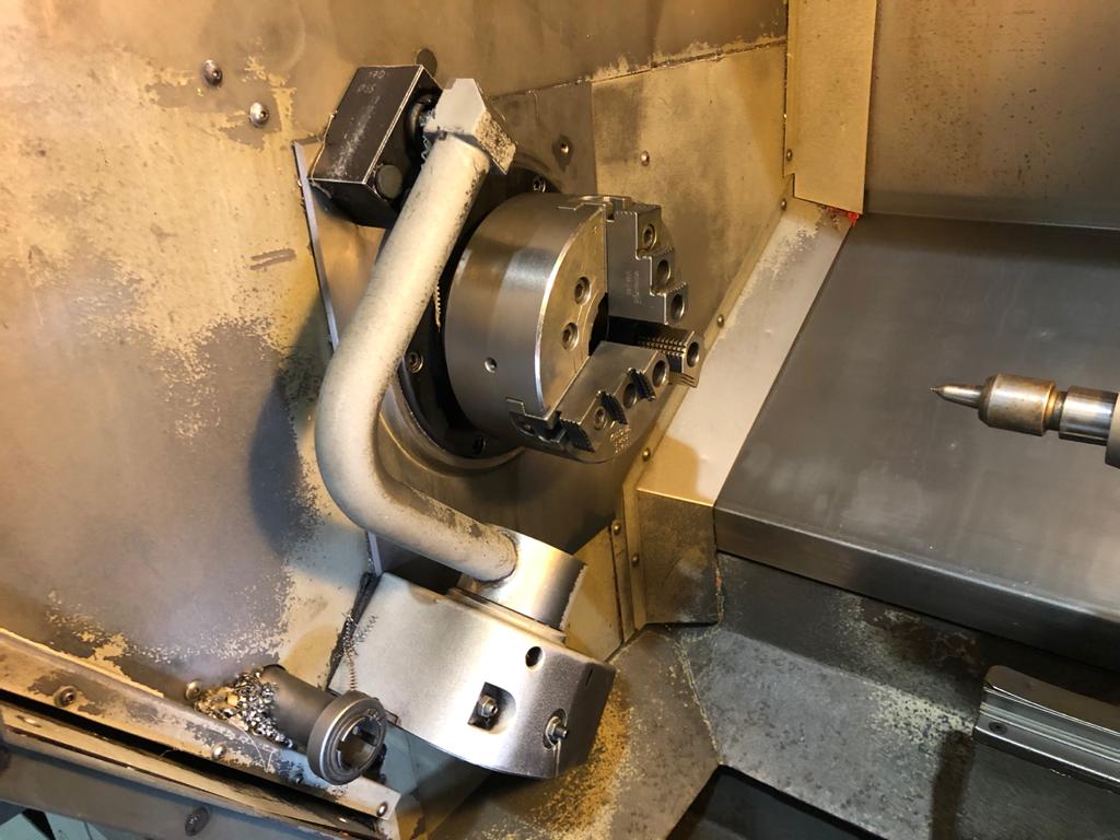 51mm. Fitted with 200mm dia. 3 jaw chuck. Servo Bar 300 Multi