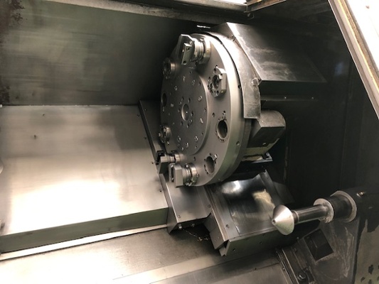 3 jaw powered chuck, tailstock. Turret tooling & swarf conveyor. Serial No. HTS40171