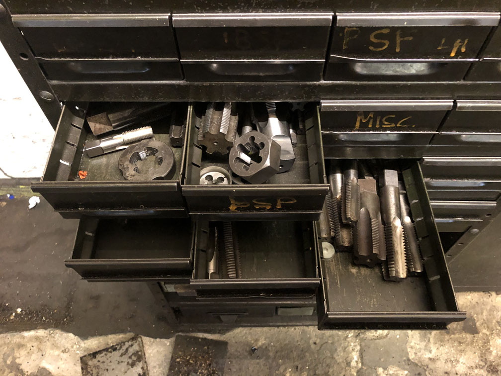 Lot 43: Large qty of HSS taps, dies & die nuts in metal cabinet
