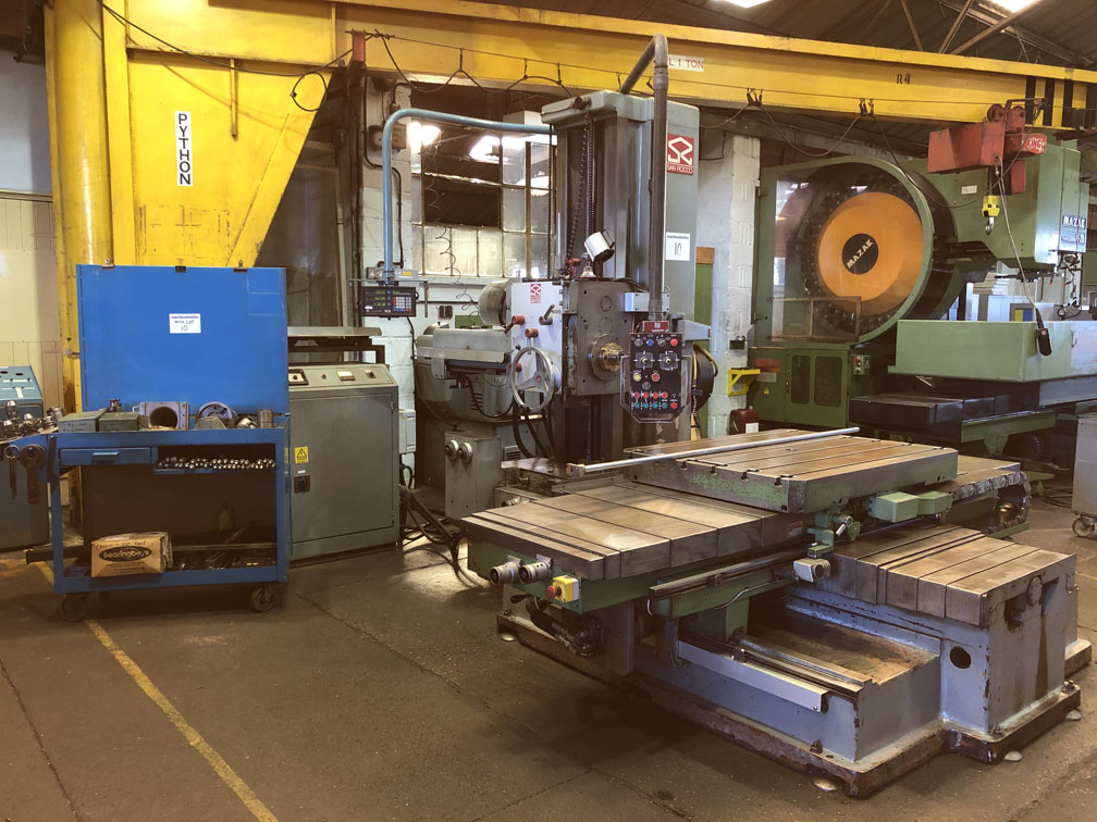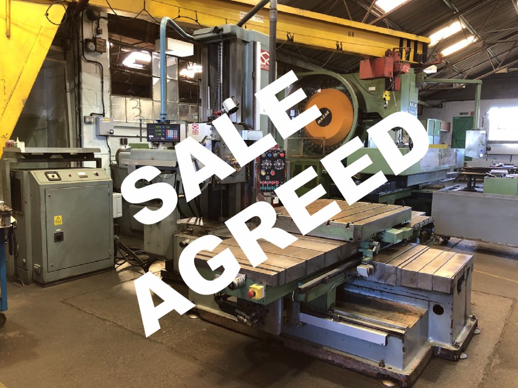 Spindle dia. 80mm. Spindle taper 40 ISO. Spindle travel 600mm. Spindle speeds 11 - 1100 rpm. Vertical travel 1000mm. Longitudinal travel 1000mm. Cross travel 1500mm. Feeds Vertical & cross travel feed 10-1000 mm/min. Longitudinal feeds 1 - 1000mm/min. Table dimensions 1220mm x 920mm. Table loading 1500 kgs. Table rotation 0.02 - 1.7 rpm. Rapid table rotation 4 rpm. Spindle motor 10HP. Feed motor 4 HP.Rapid traverse long/cross 2400mm/min. Pendant control. 2 x Autlock Chucks. Boring snout.Spindle tooling. Clamping equipment.460mm dia. facing head. Newall DP8 Digital readout (Vernier scale still with the machine but removed to house DRO) Steel mobile container containing spindle support and double swivel vertical milling attachment.