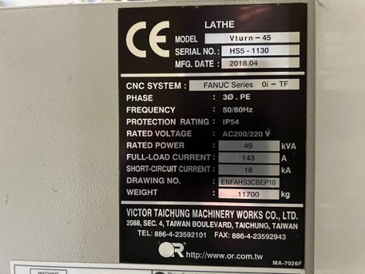 Swing over bed 780mm. Standard turning dia. 520mm. Maximum turning dia. 620mm. Swing over carriage 620mm. Distance between centres 1325mm. X/Z Axis travel 310+30mm/1250mm. Spindle bore 135mm. Bar capacity 117.5mm. Rapids X/Z 24/24m/min. X/Z Feed motors 4/4kW. X/Z Ball screw dia. x pitch 36mm x P8/50mm x P10. Maximum spindle speed 2000 rpm. Spindle motor power geared ( Cont/30min/15min) 30/37/45 kW. Spindle nose A2-11''. 10 station turret. Tailstock quill dia. 150mm. Quill stroke 150mm. Quill taper 5MT. Total power requirement 50 kVA. Coolant tank capacity 600 litres. Machine is fitted with a 381mm dia. 3 jaw chuck. 3 Point Open Ended Steady 30mm-300mm capacity. Approximate machine size 5300mm x 2700mm x 2200mm high. Approximate weight 12,700 kg. Fanuc Series 0i-TF Control. Machine Serial No. HS5 -1130. Year 2018.